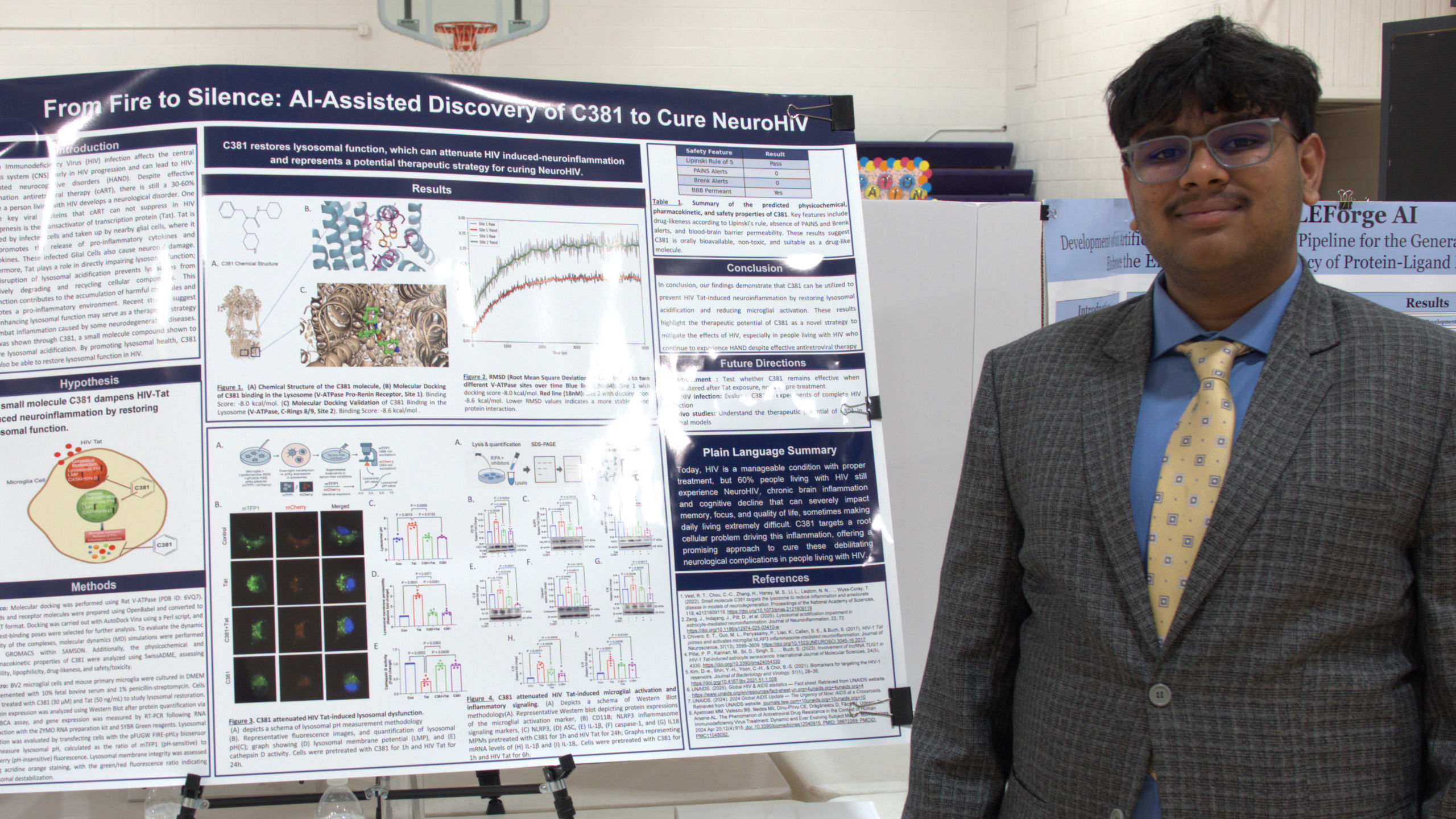 Introduction: Human Immunodeficiency Virus(HIV)-1 infection is associated with HIVassociated neurocognitive disorders (HAND), which can occur in 30–60% of people living with HIV, despite successful combination antiretroviral therapy (cART). The transactivator of transcription (Tat) protein contributes to HAND by impairing lysosomal acidification and promoting microglial neuroinflammation. C381, a small molecule previously discovered to restore lysosomal acidification, led us to hypothesize that it could also reduce HIV Tat-induced neuroinflammation. Methods: BV2 microglial cells were pre-treated with C381 (30 μM) and post treated with Tat (50 ng/mL). Western blotting and real-time PCR (RT-PCR) were used to measure inflammatory markers. Molecular docking was performed to identify C381 binding sites on the Lysosome (PDB ID: 6VQ7) using AutoDock Vina. Results: Molecular Docking identified the V-ATPase as the primary binding site of C381. The strongest sites on the V-ATPase were the pro-renin-receptor and the V-ATPase Crings 4/5 region which both play a role in acidifying the lysosome. In vitro, a C381 pretreatment was able to significantly reduce Tat induced neuroinflammation markers. Conclusion: In conclusion, C381 attenuates HIV-tat induced microglial neuroinflammation by restoring lysosomal acidification. Future studies will investigate post treating C381, utilizing in-vivo models, and including the full HIV infection, not just Tat.