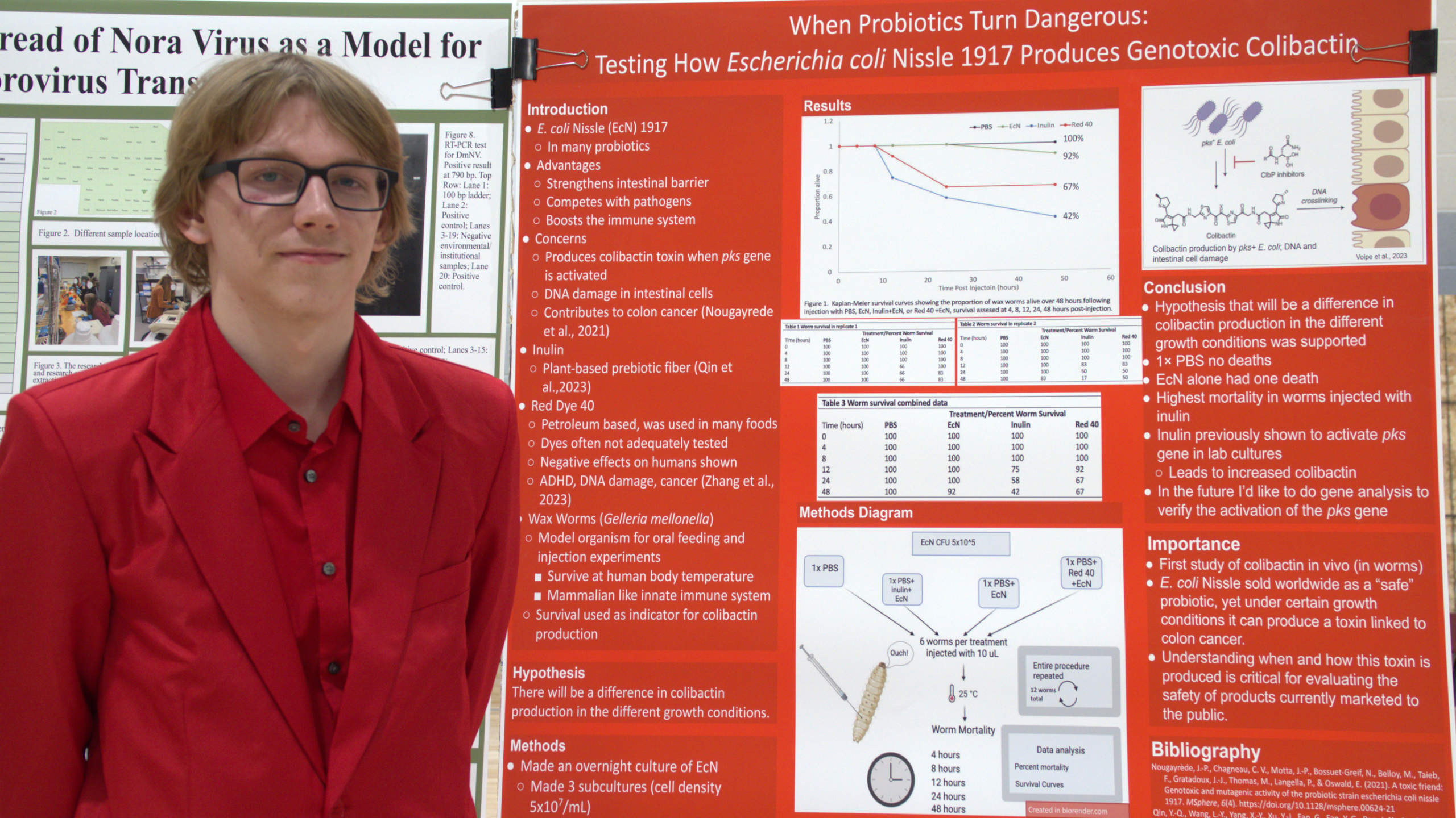 The purpose of this study was to investigate which conditions cause E. coli Nissle (EcN) to create colibactin. The hypothesis was that Red 40 would have an effect on colibactin expression. Cultures with EcN only, EcN and inulin, EcN and Red 40 were prepared, incubated for 4 hours, and standardized based on OD. These cultures, as well as a control of PBS, were injected into Galleria mellonella larvae, which were then incubated at 37 °C. They were monitored for mortality over five days to determine whether any of the growth conditions caused the EcN to produce colibactin by activating the pks gene. Survival curves were created. The worms injected with the inulin (positive control) had a higher mortality rate than the worms injected with Red 40, but both of these treatments had higher mortality rates than the worms injected with PBS alone (negative control) and EcN alone (baseline control). All of the worms injected with PBS survived, and all but 1 of the worms injected with just EcN survived.